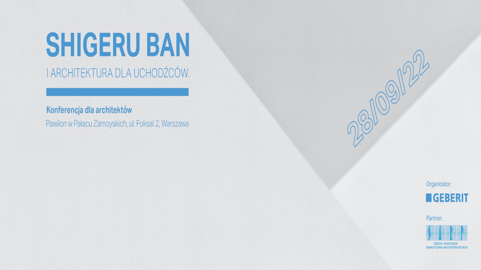 To właśnie 28 września 2022 roku, Shigeru Ban będzie gościem specjalnym konferencji organizowanej przez firmę Geberit, której partnerem jest Oddział Warszawski Stowarzyszenia Architektów Polskich. Konferencja ,,Shigeru Ban i architektura dla uchodźców” odbędzie w Pawilonie SARP w Pałacu Zamoyskich przy ulicy Foksal 2 w Warszawie.